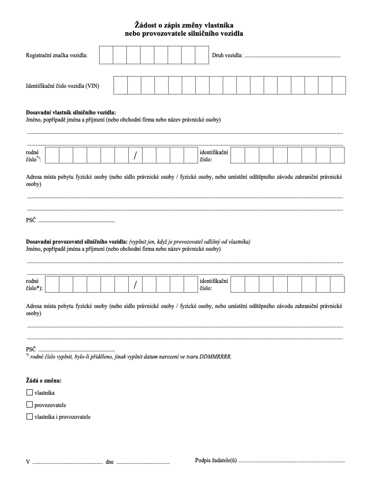 Oficiální formulář „Žádost o zápis změny vlastníka nebo provozovatele silničního vozidla“ přímo z webu Ministerstva dopravy ČR.