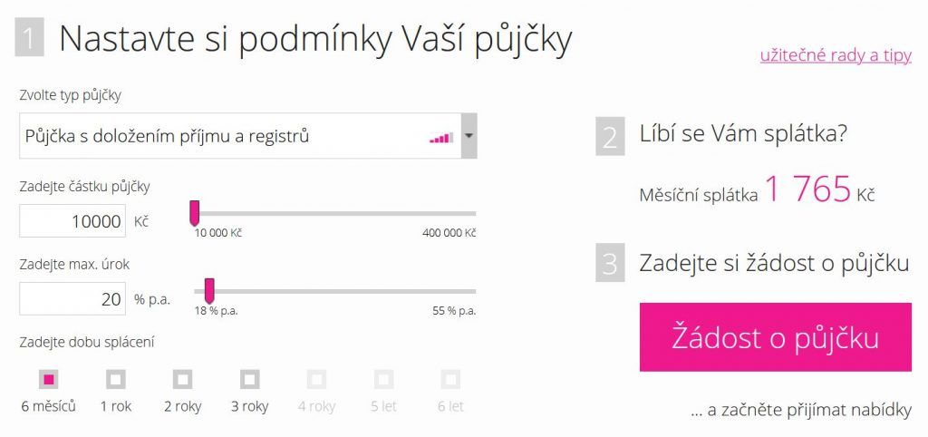 V prvním kroku uživatel využije jednoduchou kalkulačku, ve které navolí své požadavky. Nejprve si zvolí typ půjčky, od které se odvíjejí další parametry, jako je doba splácení, výše půjčky a maximální úrok.