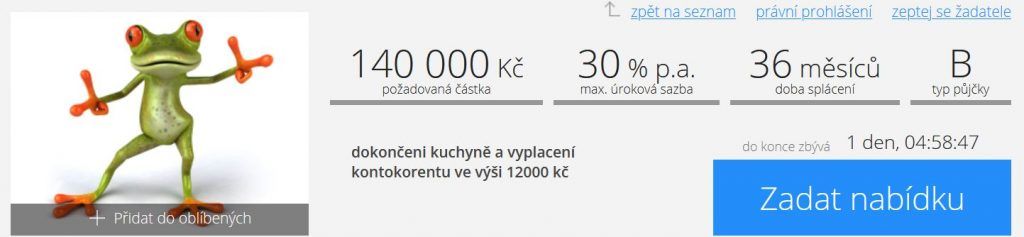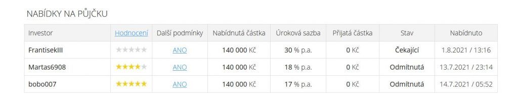 Žádost se nakonec uveřejní mezi ostatními aukcemi, ze kterých si mohou investoři vybírat podle svých preferencí. Pokud se někomu z nich bude některá žádostí zamlouvat, vloží pod ní komentář se svou nabídkou.