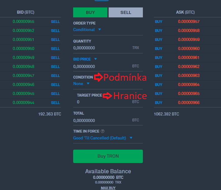 Limit a market – přednastavená možnost v rozhraní, pokud člověk chce kryptoměnu nakoupit okamžitě, stačí mu zadat množství (Quantity) a jako Bid Price dát cenu Ask (což je ve své podstatě standardní příkaz Market). Lze také zadat běžný limitní příkaz