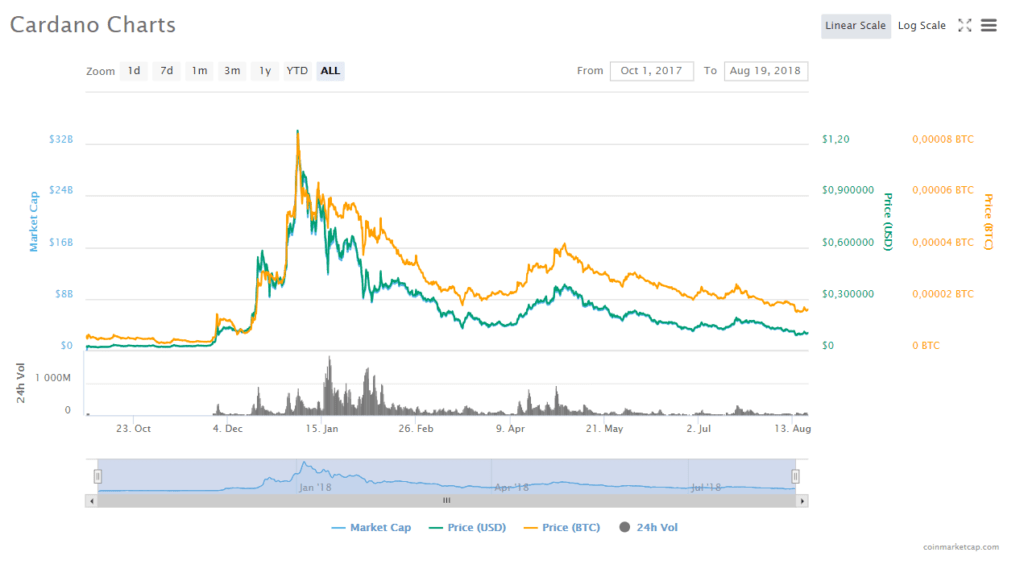 Samotná síť Cardano se spustila 29. září 2017. Spolu s prosincovou Bitcoinovou horečkou se cena na začátku ledna vyšplhala až na 1.22 dolarů. Od té doby se cena v průběhu korekce trhu, společně s Bitcoinem i dalšími kryptoměnami, pohybuje směrem dolů.