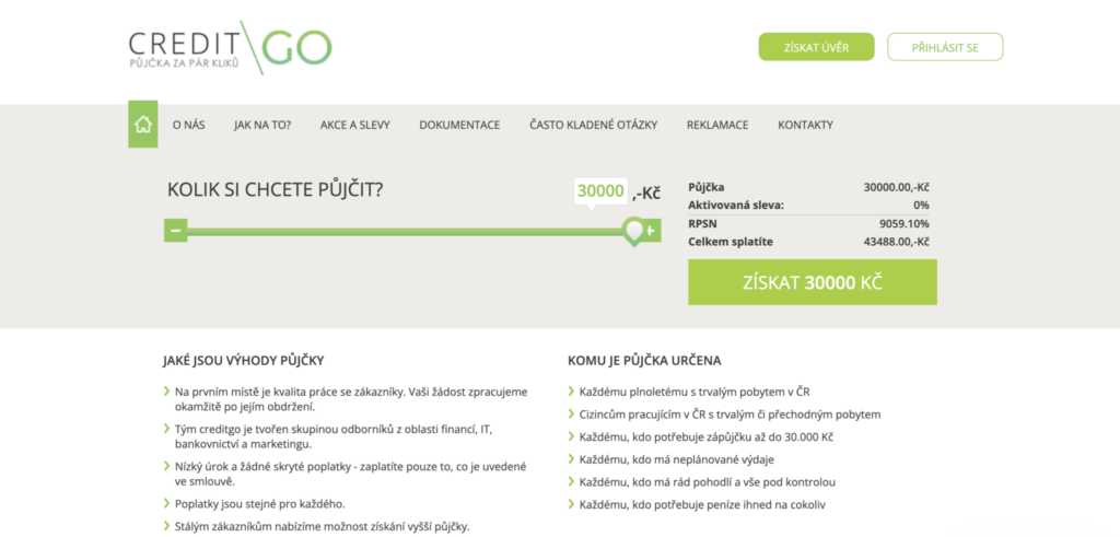 Celá registrace a žádost o úvěr se odehrává prostřednictvím webových stránek creditgo.cz, případně jejich mobilní verze.