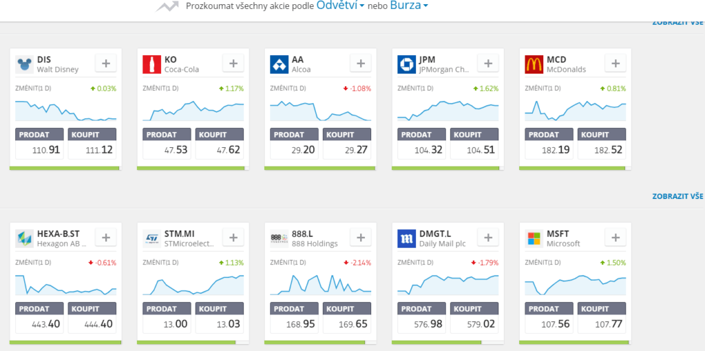 eToro umožňuje od roku 2013 nákup a prodej akcií. Široké portfolio akcií nabízí i akcie od Apple, Microsoft nebo Alphabet (Google).