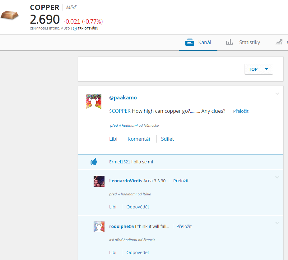 Social trading v praxi – jednotliví obchodníci probírají budoucí vývoj ceny mědi.