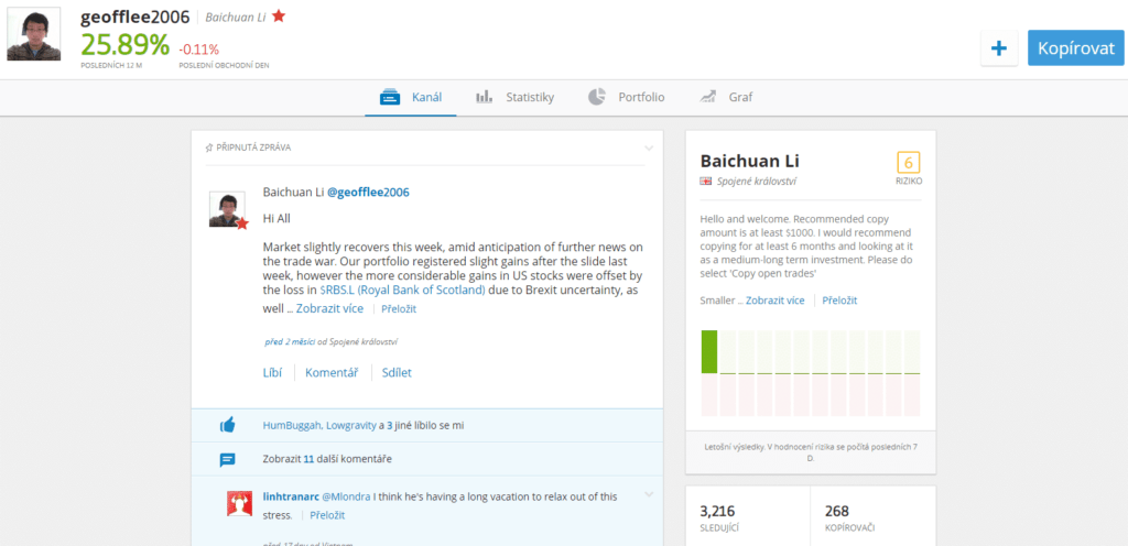 Takto vypadají profily uživatelů, tohoto obchodníka sleduje 3 216 lidí a 268 kopíruje jeho investice.