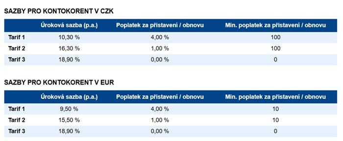 Podle typu Tarifu se pak liší výše poplatků za úvěr a výše úroku od 10,30 % do 18,9 % (přehledně uvádí níže tabulka).