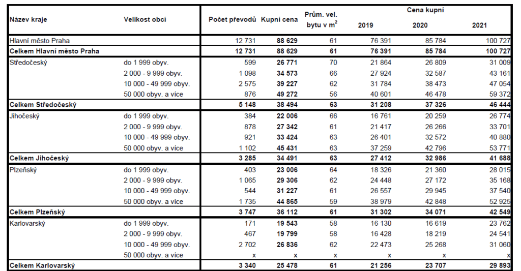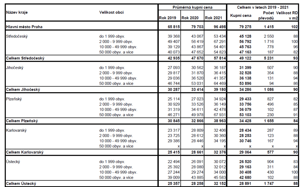 PRŮMĚRNÉ CENY BYTŮ V ČR V LETECH 2019 – 2021 V ZÁVISLOSTI NA VELIKOSTI OBCÍ (v Kč/m2)
