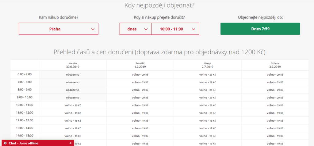 E-shop Košík dováží potraviny a veškerý další sortiment denně od 6:00 do 23:00v hodinových intervalech. Určitě je jistější objednávku vytvořit co nejdelší dobu před požadovaným časem doručení, jelikož má každý interval určitou maximální kapacitu. Obvykle však nebývá problém mít v případě objednávky z Košíku nákup doma během dvou až tří hodin. Objednávku je možné provést až týden před dnem doručení.