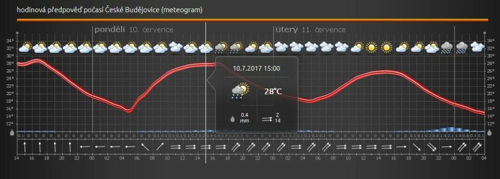 Kromě panelů se pro jednotlivá místa zobrazí také onen unikátní meteogram. U každého místa lze posunováním kurzoru grafu sledovat vývoj všech součástí předpovědi, počasí po hodinách, až dva dny dopředu. Komu nevyhovuje grafové zobrazení, stejné údaje dohledá v tabulkách.