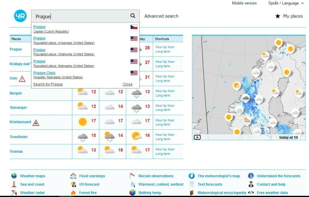 Na oficiálních stránkách sice není tato norská předpověď počasí česky, ukážeme si však českou alternativu pro počasí – norský web yrno může být totiž i v češtině.