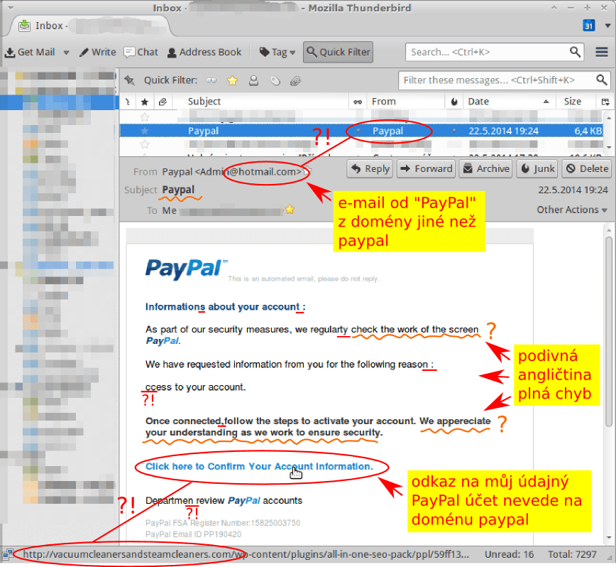 Obdržené emaily se tváří, že jsou poslány službou PayPal. Jedná se pokus o tzv. phishingový útok na PayPal účet. Podobné podvodné emaily dostávají také uživatelé bank. Podvodníci se nezaměřují pouze na společnost PayPal.