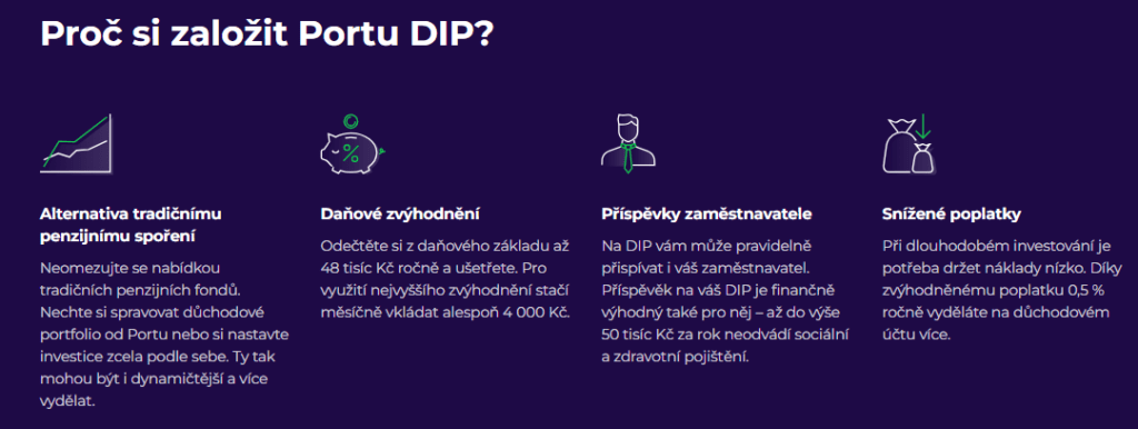 DIP Portu je alternativou k tradičnímu penzijnímu spoření. Jak to funguje? V rámci DIP Portu si investor sám zvolí, jak bude na důchod investovat, nebo to opět může nechat na Portu. Vklady na DIP účet si lze odečíst z daňového základu až do výše 48 tisíc Kč ročně.