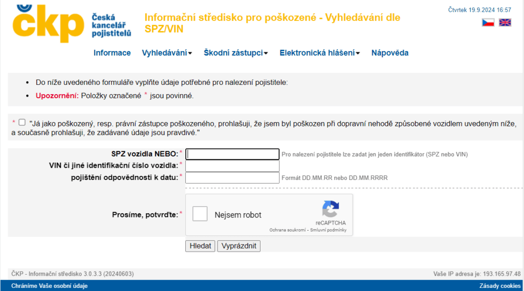 Stačí zadat SPZ vozidla a ČKP najde informace ohledně jeho pojištění.