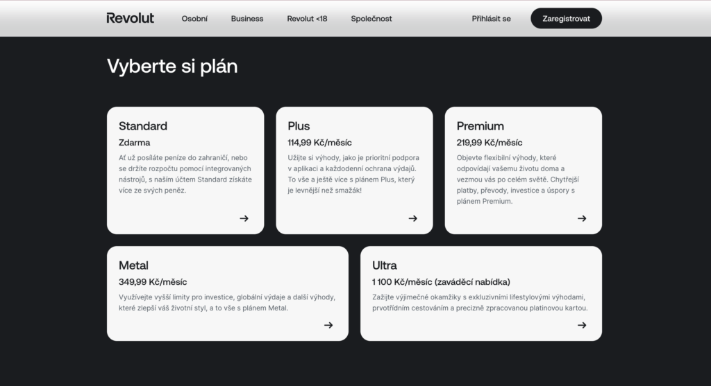 Účet Revolut nabízí pět různých tarifů, každý s odlišnými výhodami a poplatky. Výběr toho správného závisí na konkrétních potřebách a způsobu, jak se využívají finanční služby.