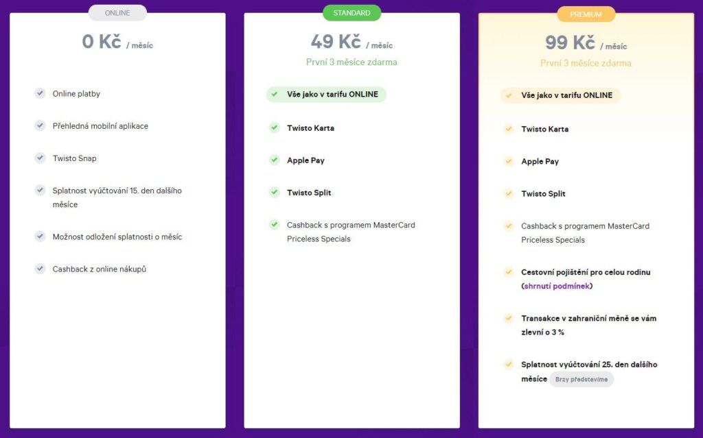 Tarify Twisto účtů se liší rozsahem možných služeb. Případné změně na vyšší tarif musí předcházet schválení od Twisto, není možné jej nárokovat automaticky.