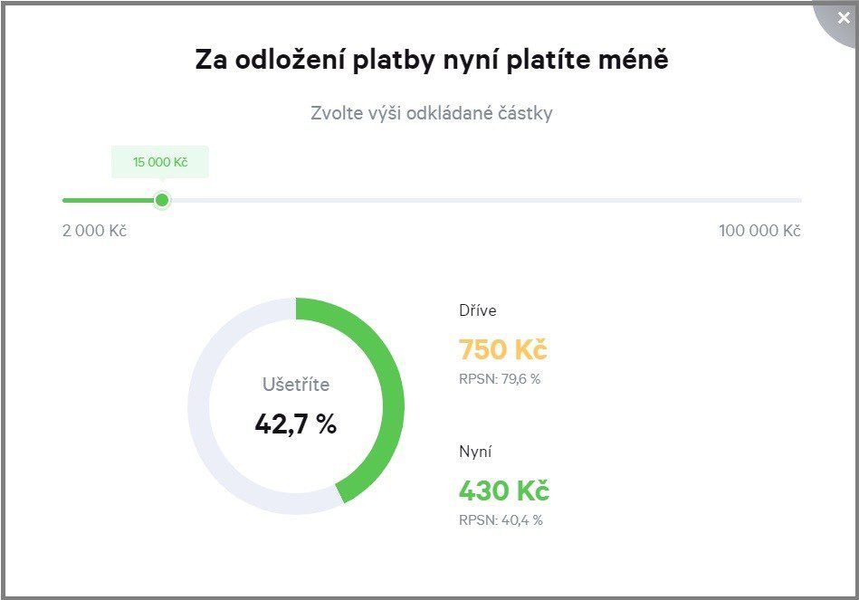 Z kalkulačky se zájemce dozví, že například za odložení 15 000 Kč o 1 měsíc zaplatí 450 Kč, což odpovídá 40,4 % RPSN. Levné to tedy určitě není, ale pokud by se jednalo o výjimečnou situaci, není to až tak závratná částka.