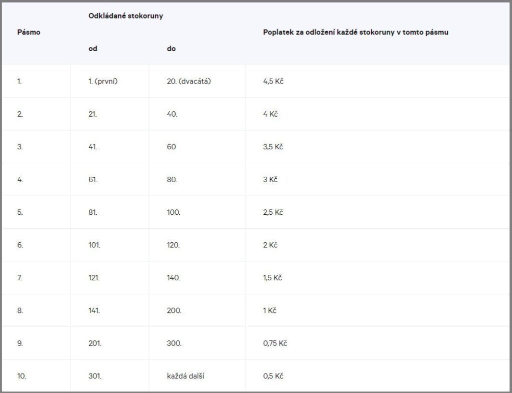 Obecně přitom platí, že za každou započatou stokorunu odkládané částky naroste poplatek o částku uvedenou v další tabulce: