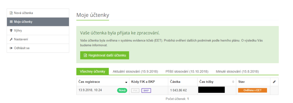 Zároveň hráčský profil udržuje záznam o všech registrovaných účtenkách a jejich stavu. K tomu slouží sekce „Moje účtenky“. Také umožňuje se podívat, pokud jedna z registrovaných účtenek vyhrála.