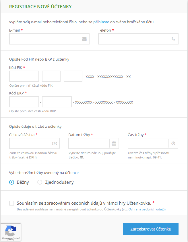 Takto vypadá registrace nové účtenky, pokud není zřízen hráčský profil.